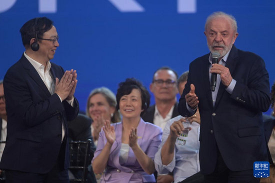 10月9日,巴西總統(tǒng)盧拉(右)與比亞迪董事長兼總裁王傳福(左)在巴西東北部巴伊亞州卡馬薩里市出席慶祝儀式。新華社發(fā)(盧西奧·塔沃拉攝)