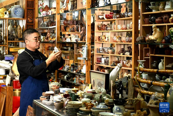 10月11日,在位于河北省石家莊市橋西區(qū)的工作室內,李軍航在檢查殘破瓷器情況。