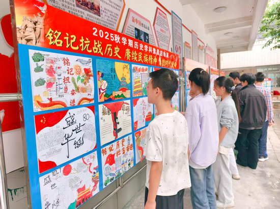 作品完成后,歷史組老師們利用休息時(shí)間,對優(yōu)秀作品進(jìn)行了篩選和整理,并精心設(shè)計(jì)、布置了專題展板。展板一經(jīng)展出便吸引了眾多師生駐足觀看。課間時(shí)分,同學(xué)們或凝神細(xì)讀,或低聲交流,在一筆一畫、一文一圖中感受歷史的厚重與民族的堅(jiān)韌。這道獨(dú)特的“風(fēng)景線”,不僅美化了校園環(huán)境,更營造了“時(shí)時(shí)受教育,處處受熏陶”的濃厚學(xué)習(xí)氛圍,讓歷史知識(shí)“活”了起來,讓民族精神“立”了起來。