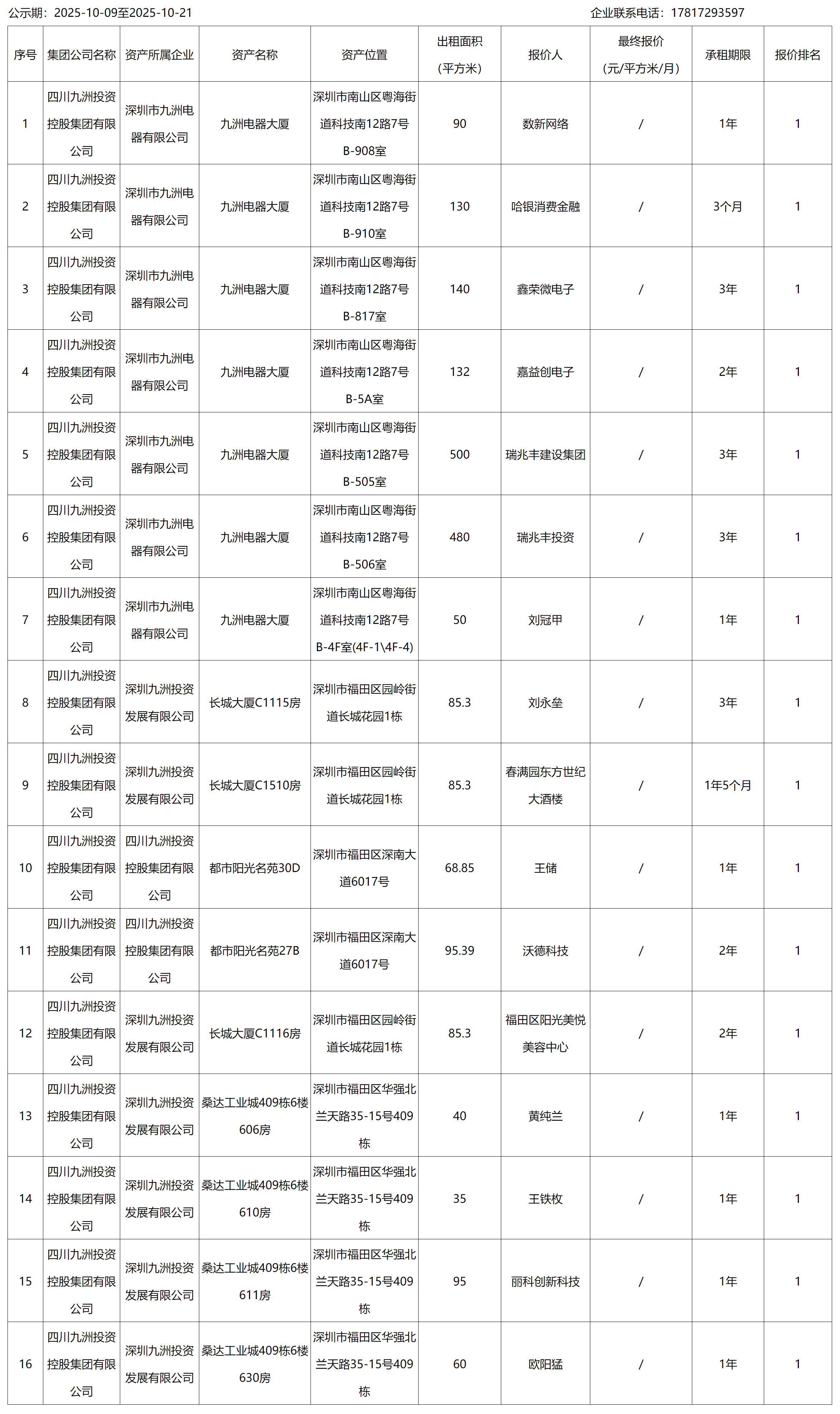 深圳市九洲光電子有限公司代管房產(chǎn)九洲電器大廈、長城大廈、都市陽光名苑、桑達(dá)409棟出租結(jié)果公示