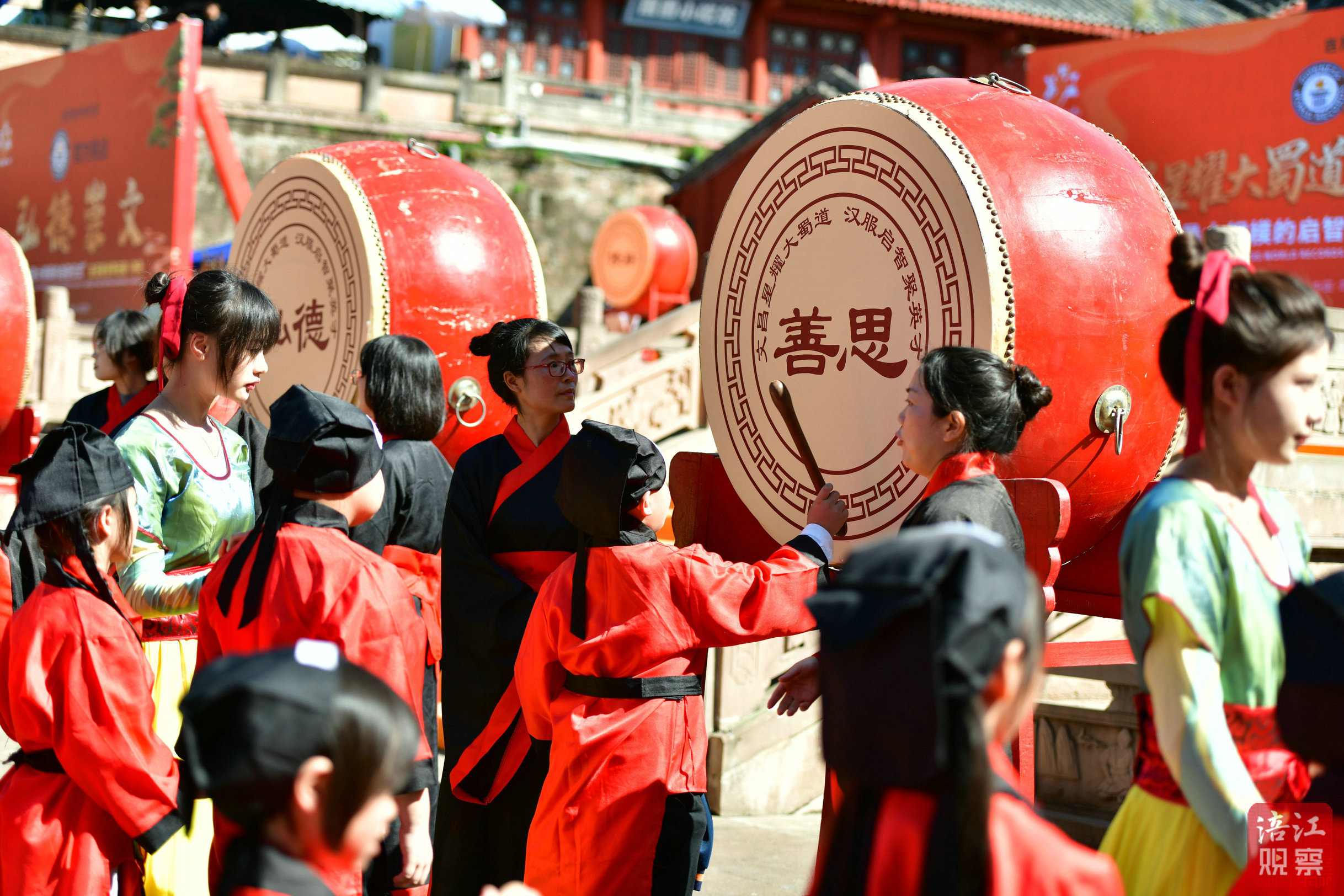 在“擊鼓明志?創(chuàng)功業(yè)”環(huán)節(jié),學(xué)子們上前擊鼓,三聲鼓響象征啟蒙、啟智、修身崇文的三重境界。