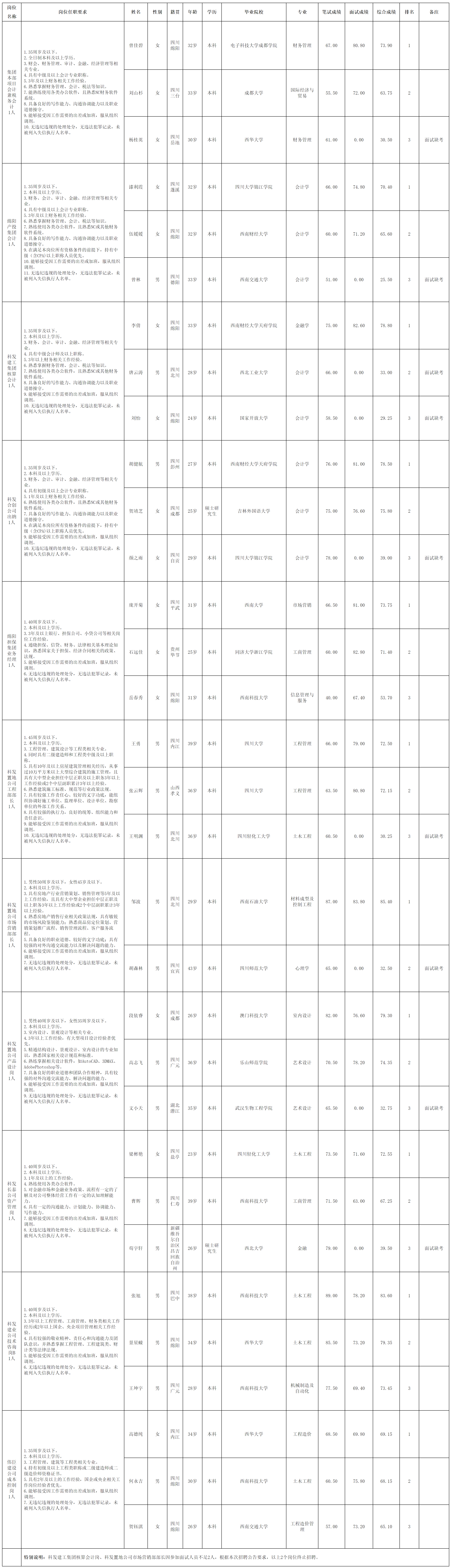 根據(jù)集團(tuán)發(fā)布的招聘公告及招聘相關(guān)規(guī)定,經(jīng)筆試、面試程序,現(xiàn)將筆試(面試)成績(jī)予以公示。