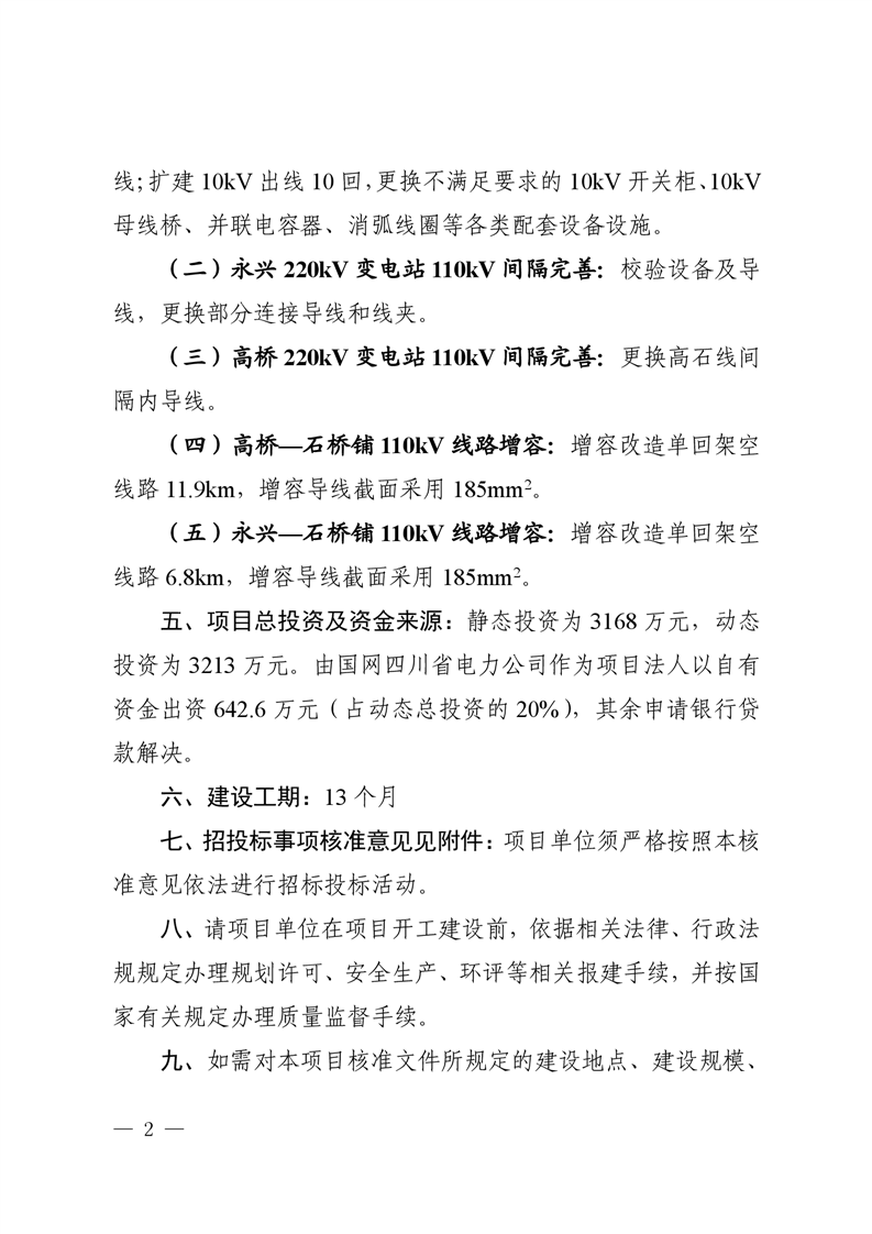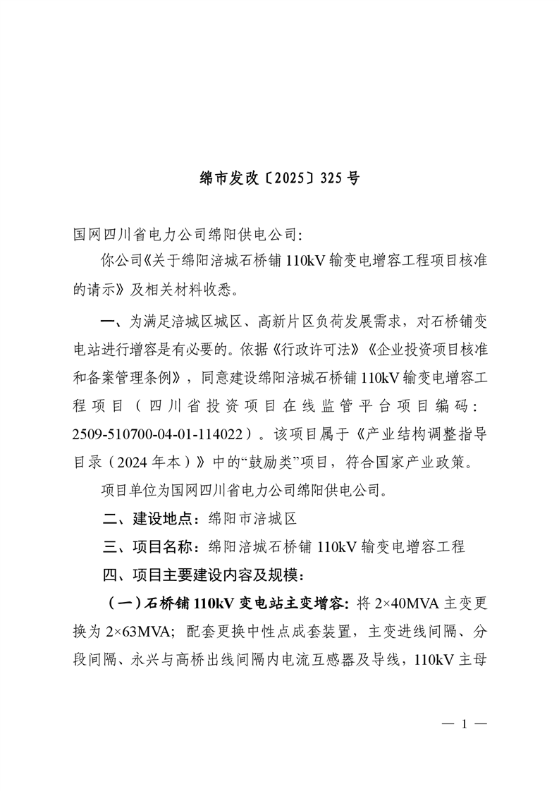 綿陽市發(fā)展和改革委員會關(guān)于綿陽涪城石橋鋪110kV輸變電增容工程項(xiàng)目核準(zhǔn)的批復(fù)