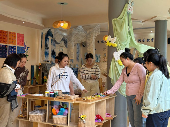 在黨支部副書記薛梅的帶領(lǐng)下,行政團(tuán)隊與全體教師深入各班,對扎染、面塑、造紙等八大非遺區(qū)角進(jìn)行現(xiàn)場觀摩與研討。