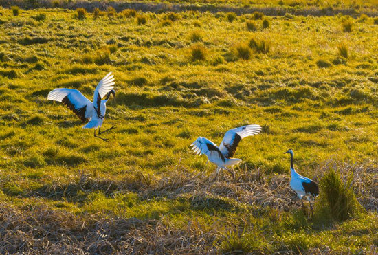 10月9日,在黑龍江撓力河國家級自然保護(hù)區(qū),丹頂鶴在濕地中活動(無人機(jī)照片)。