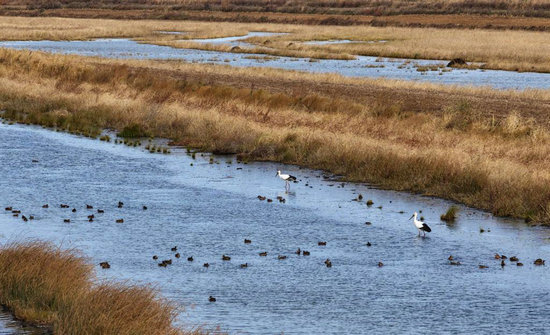 10月14日在黑龍江省同江市三江口國家濕地公園拍攝的東方白鸛和野鴨(無人機(jī)照片)。