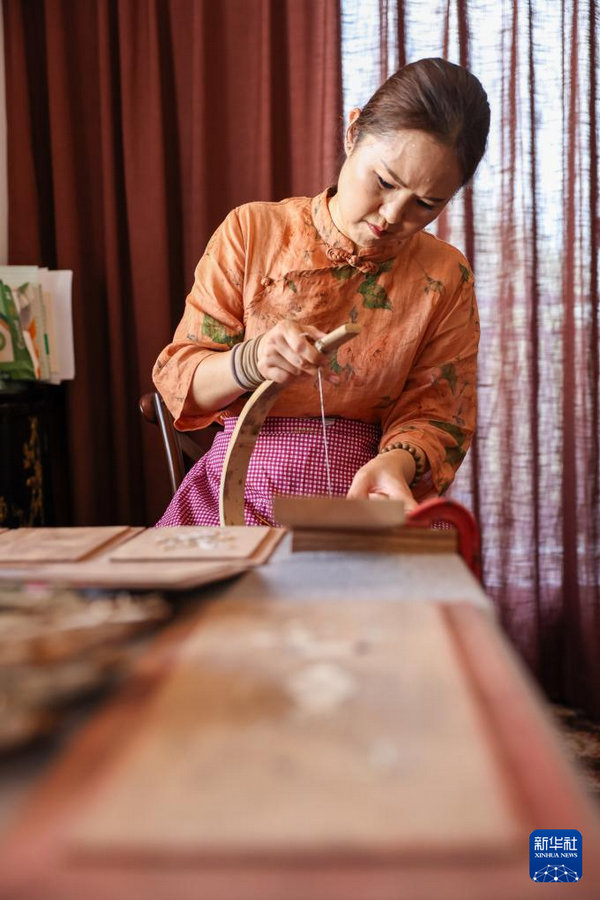 摘要:10月15日,胡蓉在孔浦街道怡江社區(qū)的非遺工作室內(nèi)展示骨木鑲嵌技藝。