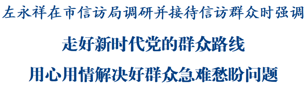 來到市信訪局,左永祥走進人民群眾來訪接待中心,聽取全市信訪工作情況匯報,察看中心運行情況,詳細了解群眾來訪接待、事項辦理等具體流程,并與工作人員親切交談,叮囑大家要始終站穩(wěn)群眾立場,把群眾當(dāng)家人、把群眾事當(dāng)家事,真實了解把握群眾所思所想所憂所盼,解決好群眾合理訴求;要求中心加強資源整合,優(yōu)化工作機制,推動政策完善、作風(fēng)轉(zhuǎn)變、效能提升,更好地為群眾服務(wù)。隨后,左永祥來到接訪室,認真傾聽群眾反映的問題,詢問有關(guān)情況,現(xiàn)場分析問題癥結(jié)、研究解決方案,耐心細致為群眾答疑解惑,要求有關(guān)方面加強統(tǒng)籌聯(lián)動,強化跟蹤督辦,依法依規(guī)推動問題限期解決;同時堅持舉一反三,排查化解共性問題,努力做到以“一件事”帶動“一類事”解決,更好維護人民群眾合法權(quán)益。