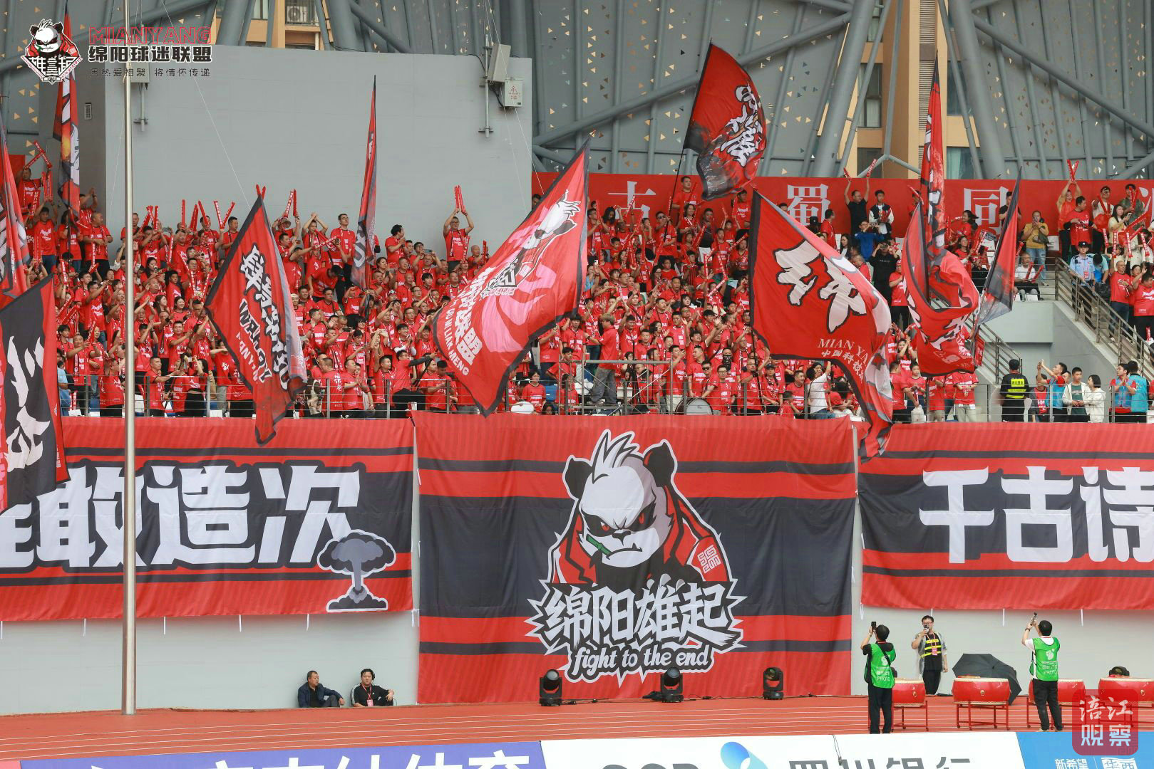 在旗幟規(guī)模與設(shè)計上,綿陽球迷聯(lián)盟下足了功夫。除了4米×4.85米的主旗,他們還牽頭制作了副旗、區(qū)域旗和戰(zhàn)斗旗。比賽時,宋世興高擎主旗在看臺中央飄揚,副旗和區(qū)域旗在兩側(cè)呼應(yīng),戰(zhàn)斗旗則在球迷方陣中穿梭,形成“遍地開花”的旗陣。