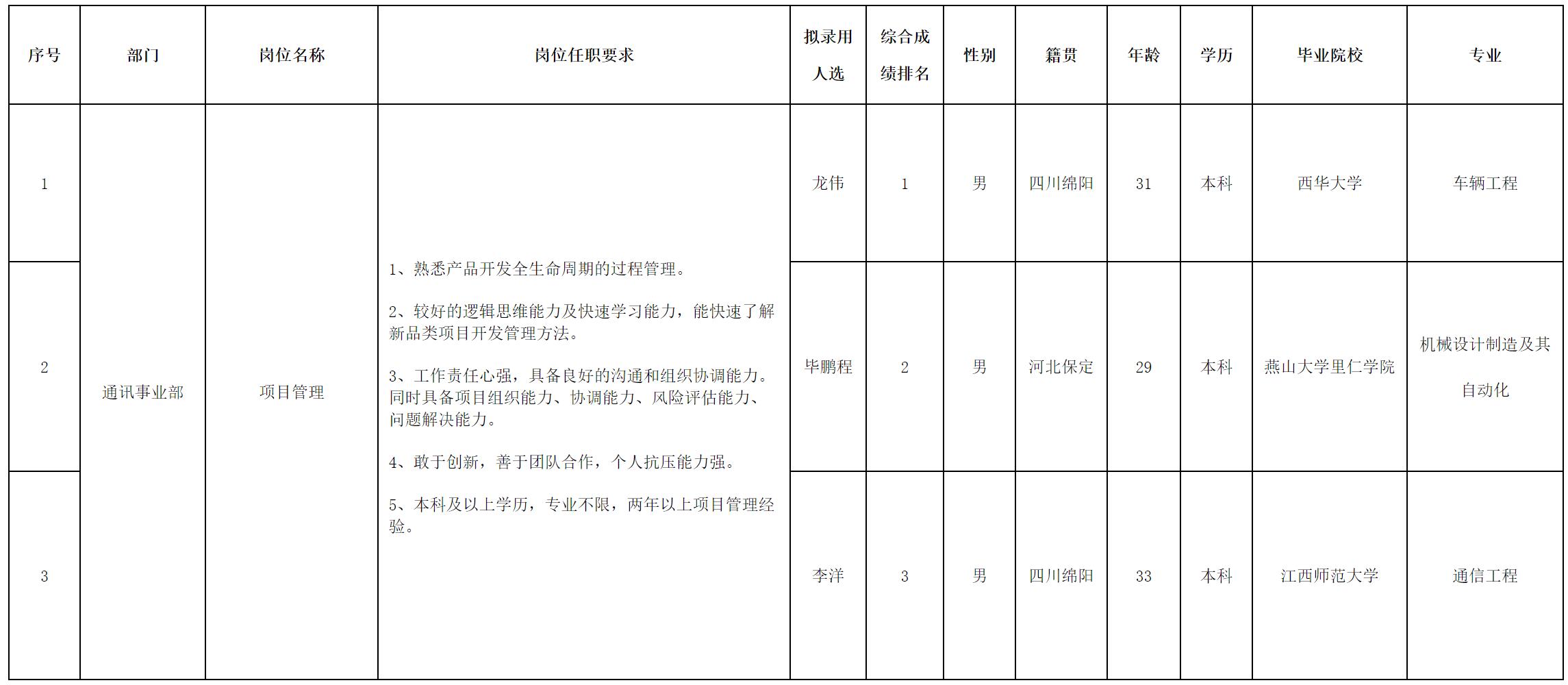 根據(jù)四川華豐科技股份有限公司發(fā)布的招聘公告及招聘相關(guān)規(guī)定,經(jīng)測(cè)試等程序,擬錄用龍偉等同志到四川華豐科技股份有限公司工作,現(xiàn)予以公示,具體情況如下: