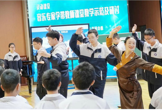 第一節(jié)示范課堂——沉浸雪域,解碼天籟之秘。涪城區(qū)音樂學帶教師、綿陽市實驗中學何江濤老師執(zhí)教《雪域天音——弦子、囊瑪與堆諧》。何老師以藏族歌舞為主線,運用沉浸式教學策略,通過講述文成公主歷史故事、介紹扎木聶樂器、融合傳統(tǒng)歌舞與現(xiàn)代創(chuàng)編舞蹈《起舞吧·拉薩》等手段,引導學生將歌聲、節(jié)奏與舞步融為一體,實現(xiàn)了文化浸潤與審美融合的深度教學,展現(xiàn)了該校在民族音樂教學上的探索成果。