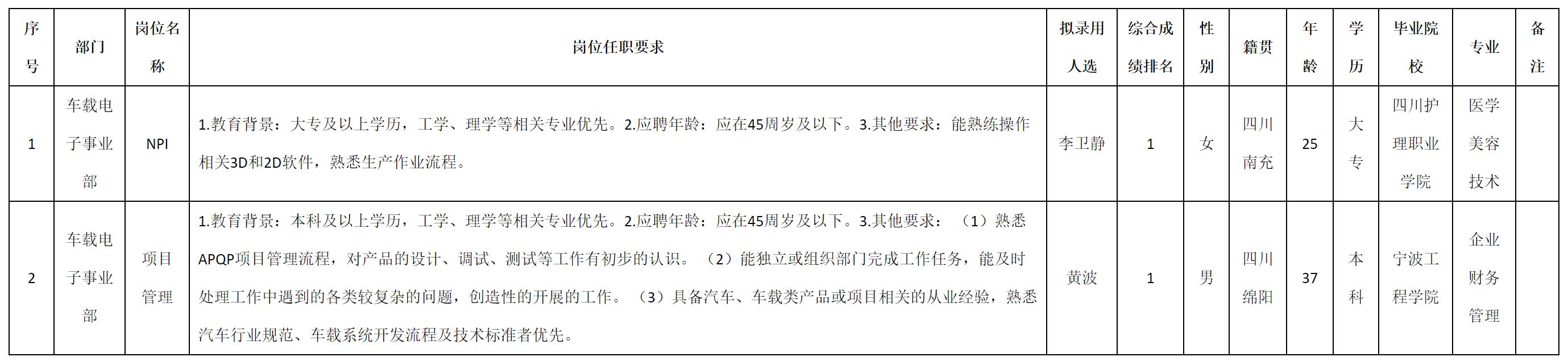 根據(jù)四川九州電子科技股份有限公司發(fā)布的招聘公告及招聘相關(guān)規(guī)定,經(jīng)測(cè)試、考察、體檢等程序,擬錄用李衛(wèi)靜等2名同志到四川九州電子科技股份有限公司工作,現(xiàn)予以公示,具體情況如下: