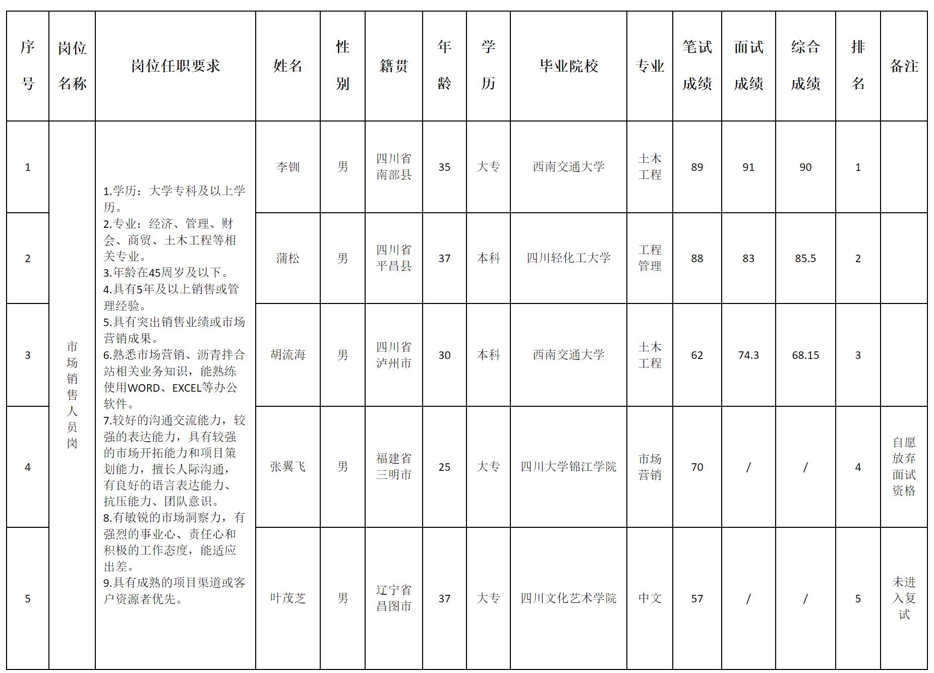 根據(jù)綿陽交發(fā)大道新材料科技有限責任公司發(fā)布的招聘公告及招聘相關(guān)規(guī)定,經(jīng)筆試、面試等程序,現(xiàn)將成績予以公示。