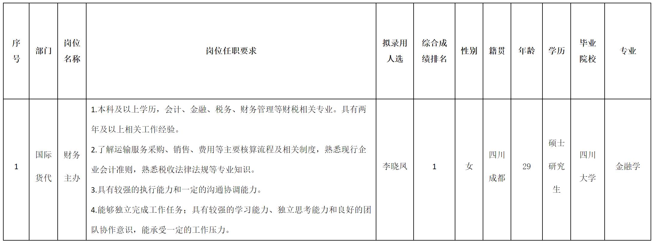 根據(jù)四川長(zhǎng)虹民生物流股份有限公司發(fā)布的招聘公告及招聘相關(guān)規(guī)定,經(jīng)面試、考察、體檢等程序,擬錄用李曉鳳同志到四川長(zhǎng)虹民生物流股份有限公司工作,現(xiàn)予以公示,具體情況如下: