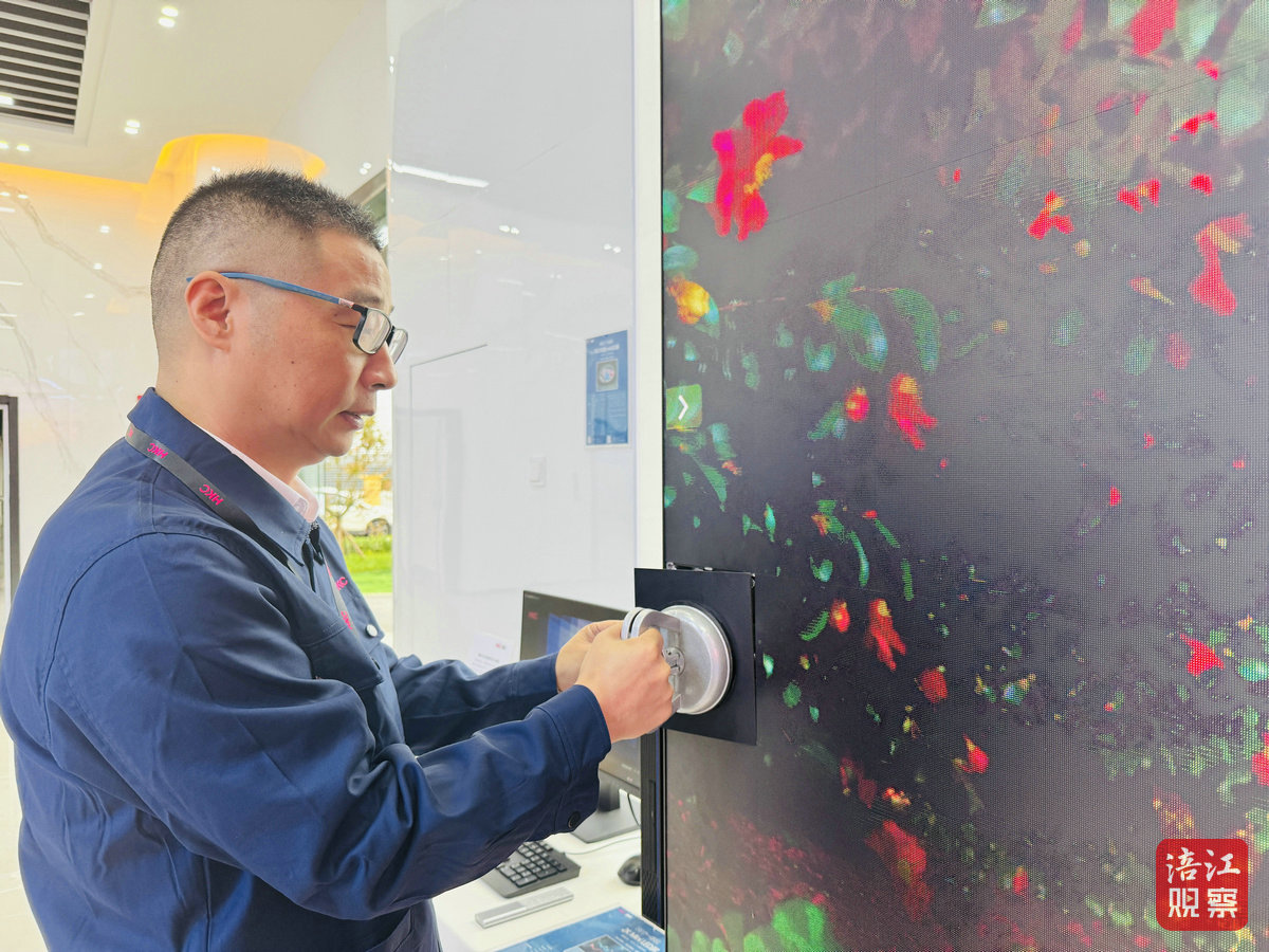 一樓的展廳內(nèi),136寸的一體機(jī)更是引人注目。“這是由無(wú)數(shù)塊8寸的Mini-LED模塊組成,采用獨(dú)特的前維護(hù)設(shè)計(jì),就像拼樂高一樣,哪塊壞了,直接用專業(yè)吸盤工具取下來(lái)更換即可,大大降低了維護(hù)成本和時(shí)間。”蔡遠(yuǎn)橋介紹,讓這項(xiàng)高技術(shù)工藝變得直觀可感。