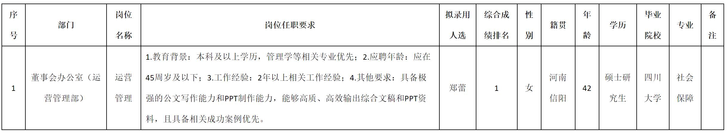 根據(jù)四川九州電子科技股份有限公司發(fā)布的招聘公告及招聘相關(guān)規(guī)定,經(jīng)測試、考察、體檢等程序,擬錄用鄭蕾同志到四川九州電子科技股份有限公司工作,現(xiàn)予以公示,具體情況如下: