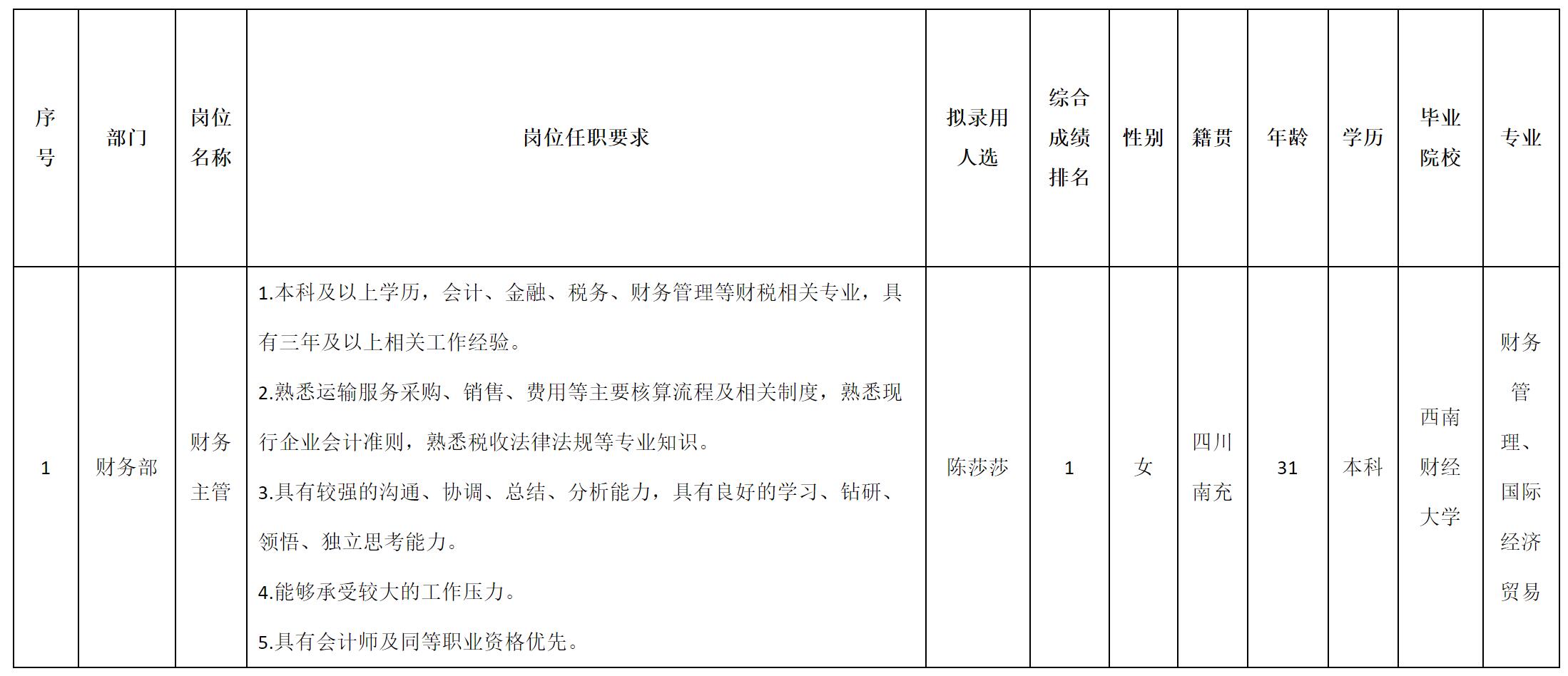 根據(jù)四川長虹民生物流股份有限公司發(fā)布的招聘公告及招聘相關(guān)規(guī)定,經(jīng)面試、考察、體檢等程序,擬錄用陳莎莎同志到四川長虹民生物流股份有限公司工作,現(xiàn)予以公示,具體情況如下