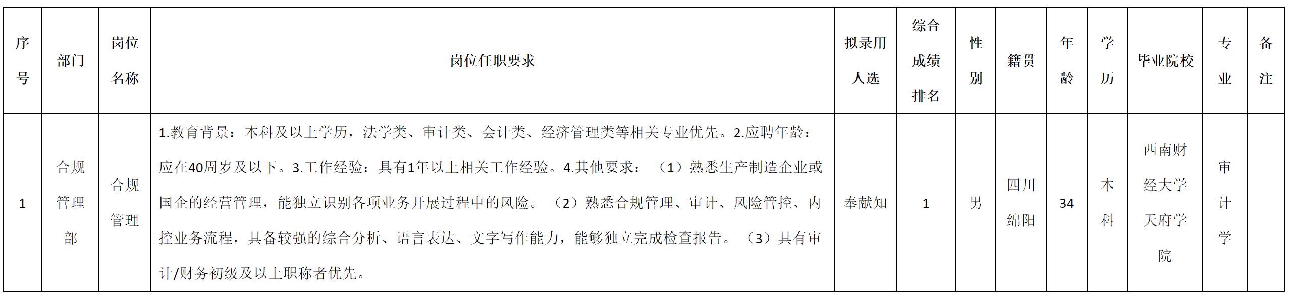根據(jù)四川九州電子科技股份有限公司發(fā)布的招聘公告及招聘相關(guān)規(guī)定,經(jīng)測(cè)試、考察、體檢等程序,擬錄用奉獻(xiàn)知同志到四川九州電子科技股份有限公司工作,現(xiàn)予以公示,具體情況如下: