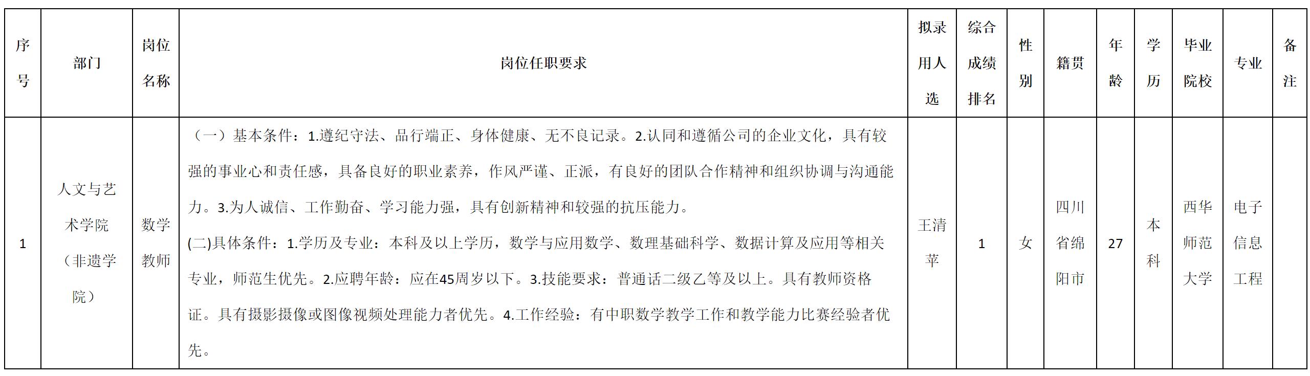 根據(jù)四川九洲教育投資管理有限公司發(fā)布的招聘公告及招聘相關(guān)規(guī)定,經(jīng)測(cè)試、考察、體檢等程序,擬錄用王清蘋同志到四川九洲教育投資管理有限公司工作,現(xiàn)予以公示,具體情況如下: