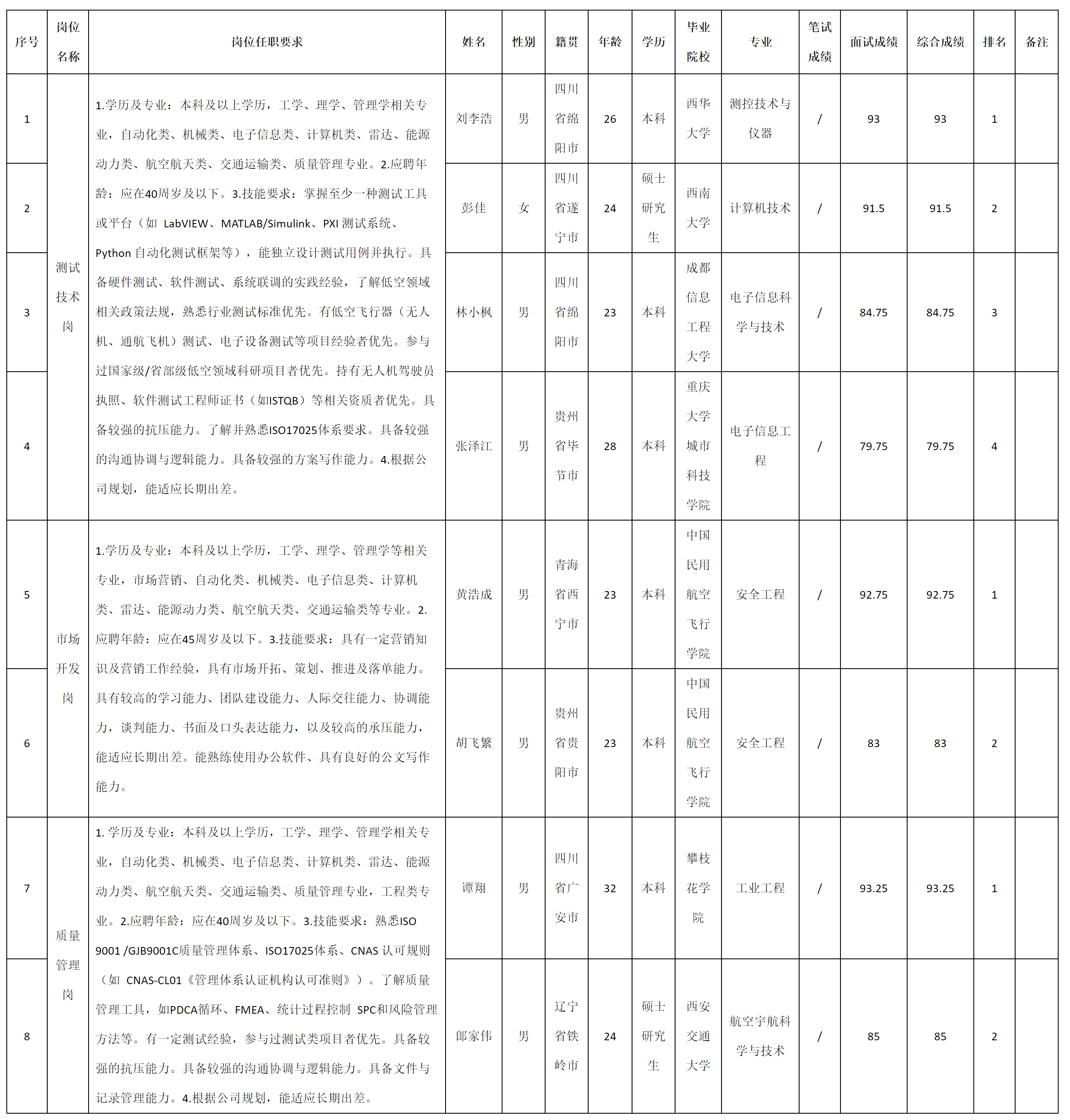 根據(jù)四川九洲永昌檢測(cè)技術(shù)服務(wù)有限責(zé)任公司發(fā)布的招聘公告及招聘相關(guān)規(guī)定,現(xiàn)將測(cè)試成績予以公示。