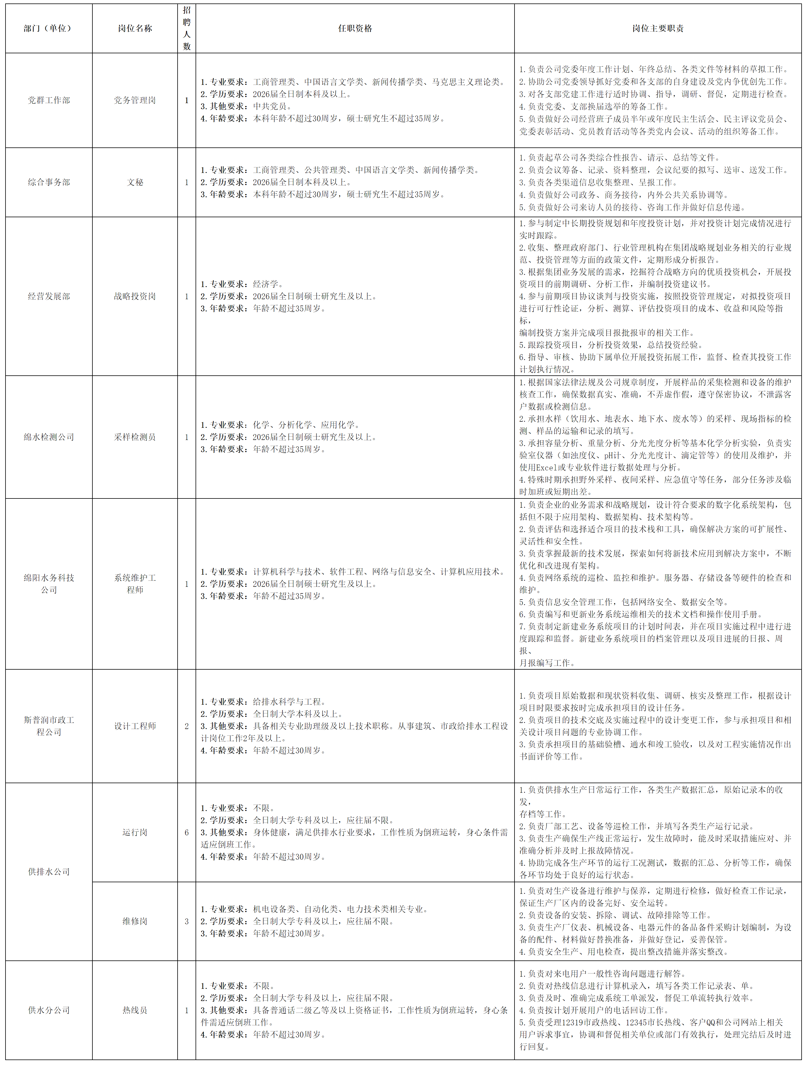 綿陽(yáng)市水務(wù)(集團(tuán))有限公司是綿陽(yáng)市市屬重要國(guó)有骨干企業(yè),始建于1966年,資產(chǎn)總額67億元,公司下轄9家全資、控股、參股子公司,內(nèi)設(shè)2家分公司。主要經(jīng)營(yíng)城鎮(zhèn)供水、污水處理、垃圾處理、供排水工程設(shè)計(jì)、工程施工及其他業(yè)務(wù),運(yùn)營(yíng)4座自來(lái)水廠、5座污水處理廠(站),設(shè)計(jì)日供水能力70萬(wàn)立方米,日污水處理能力48.25萬(wàn)立方米。公司恪守“水善利萬(wàn)物”的經(jīng)營(yíng)理念,以保障供水、服務(wù)社會(huì)、凈化污水、保護(hù)環(huán)境為己任,搶抓國(guó)家生態(tài)文明建設(shè)機(jī)遇,圍繞打造省內(nèi)水務(wù)行業(yè)標(biāo)桿企業(yè)的總目標(biāo),堅(jiān)持做強(qiáng)做優(yōu)城市供排水主業(yè),持續(xù)增強(qiáng)要素保障的核心功能,在發(fā)揮中國(guó)科技城優(yōu)勢(shì),為加快建成省域經(jīng)濟(jì)副中心上持續(xù)貢獻(xiàn)水務(wù)力量。按照公開(kāi)、平等、競(jìng)爭(zhēng)、擇優(yōu)的原則,綿陽(yáng)市水務(wù)(集團(tuán))有限公司(以下簡(jiǎn)稱“水務(wù)集團(tuán)”)現(xiàn)面向社會(huì)公開(kāi)招聘工作人員,現(xiàn)將有關(guān)事項(xiàng)公告如下: