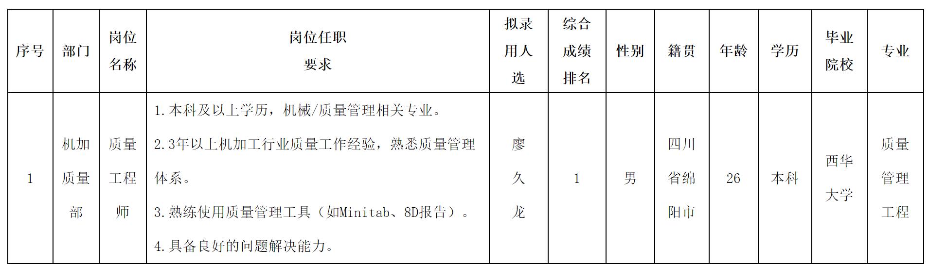 根據(jù)四川波鴻實(shí)業(yè)有限公司發(fā)布的招聘公告及招聘相關(guān)規(guī)定,經(jīng)面試、體檢等程序,擬錄用廖久龍同志到威斯卡特(綿陽(yáng))汽車(chē)零部件制造有限公司工作,現(xiàn)予以公示,具體情況如下: