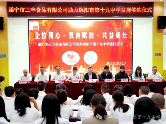 儀式現(xiàn)場,綿陽市經(jīng)開區(qū)松埡片區(qū)義務(wù)教育黨總支書記、綿陽市第十九中學(xué)執(zhí)行校長鮮紅波與遂寧市三豐食品有限公司董事長鄧添文代表雙方簽約。