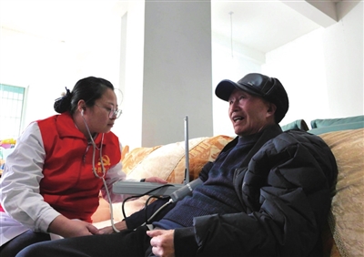 ▲志愿者為老人檢查血壓