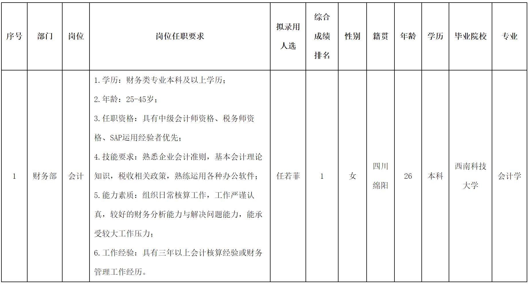 根據(jù)四川長虹國際酒店有限責任公司發(fā)布的招聘公告及招聘相關規(guī)定,經(jīng)筆試、面試、考察、體檢等程序,擬錄用任若菲同志到長虹國際酒店工作,現(xiàn)予以公示,具體情況如下:
