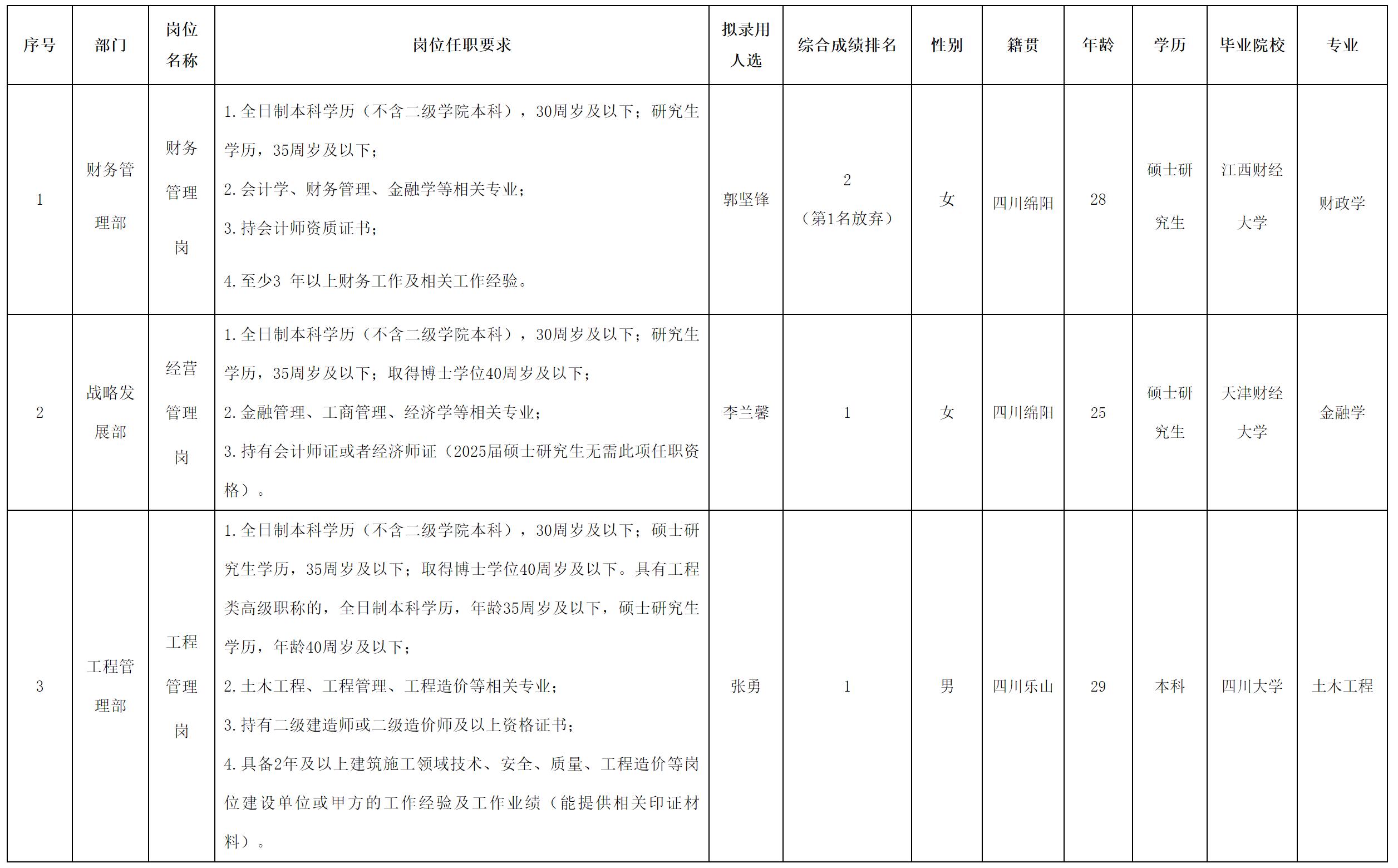 根據(jù)綿陽(yáng)機(jī)場(chǎng)(集團(tuán))有限公司2025年8月發(fā)布的《關(guān)于2025年秋季招聘財(cái)務(wù)管理等崗位的公告》以及招聘相關(guān)規(guī)定,財(cái)務(wù)管理崗、經(jīng)營(yíng)管理崗、工程管理崗經(jīng)筆試、面試、背景調(diào)查、體檢、心理測(cè)試等程序,擬錄用郭堅(jiān)鋒等3名人員為綿陽(yáng)機(jī)場(chǎng)(集團(tuán))有限公司職工,現(xiàn)予以公示,具體情況如下: