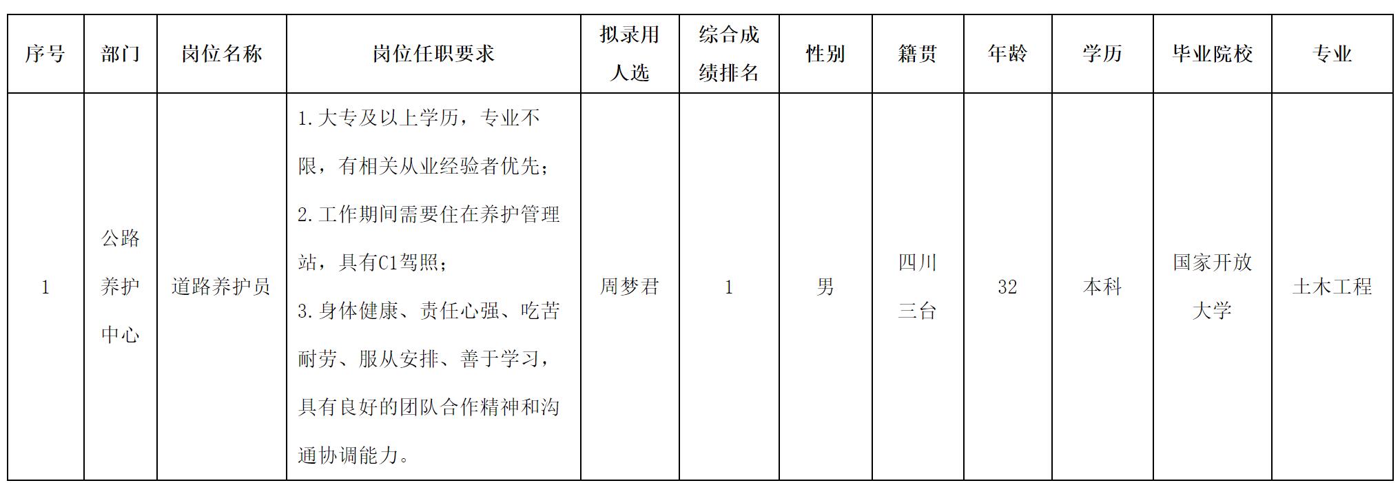 根據(jù)2025年退役軍人就業(yè)服務(wù)專項行動——“戎耀歸蜀”綿陽退役軍人及軍屬招聘活動及綿陽路橋建設(shè)集團有限責任公司招聘相關(guān)規(guī)定,經(jīng)面試、考察、體檢等程序,擬錄用周夢君同志到綿陽路橋建設(shè)集團有限責任公司工作,現(xiàn)予以公示,具體情況如下: