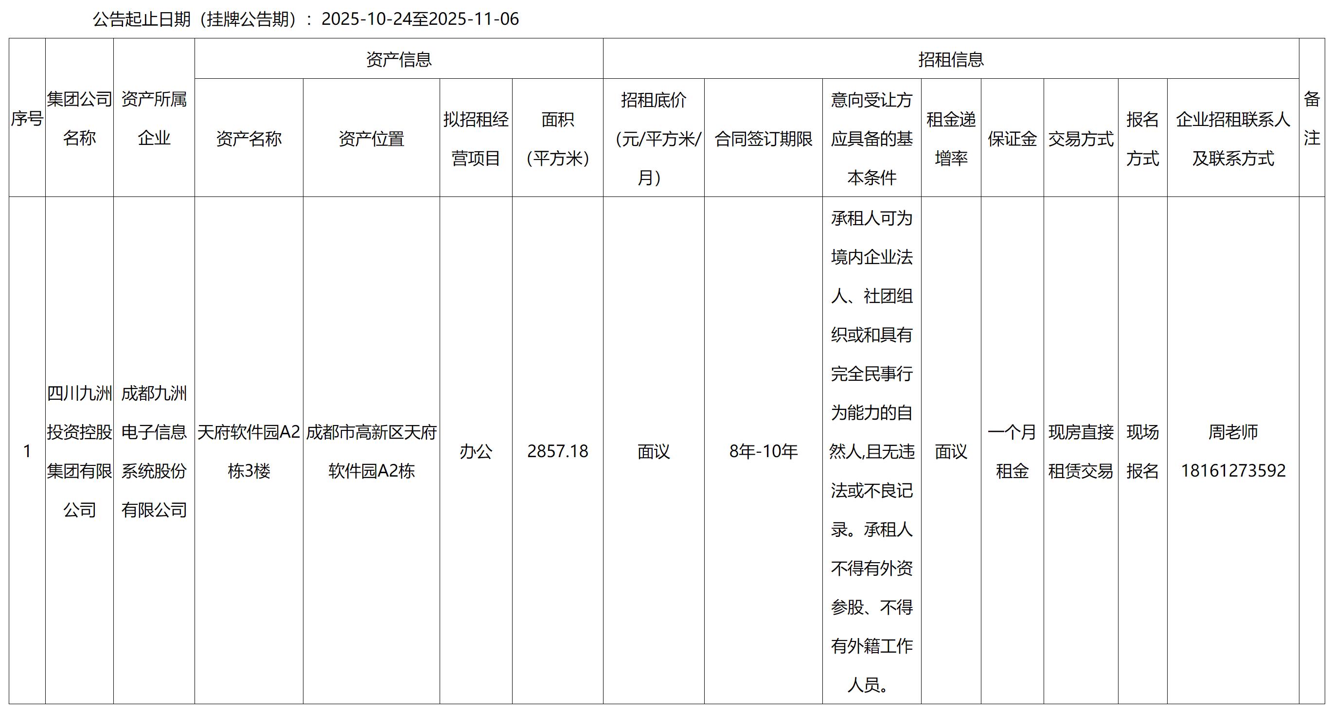成都九洲電子信息系統(tǒng)股份有限公司資產出租公告