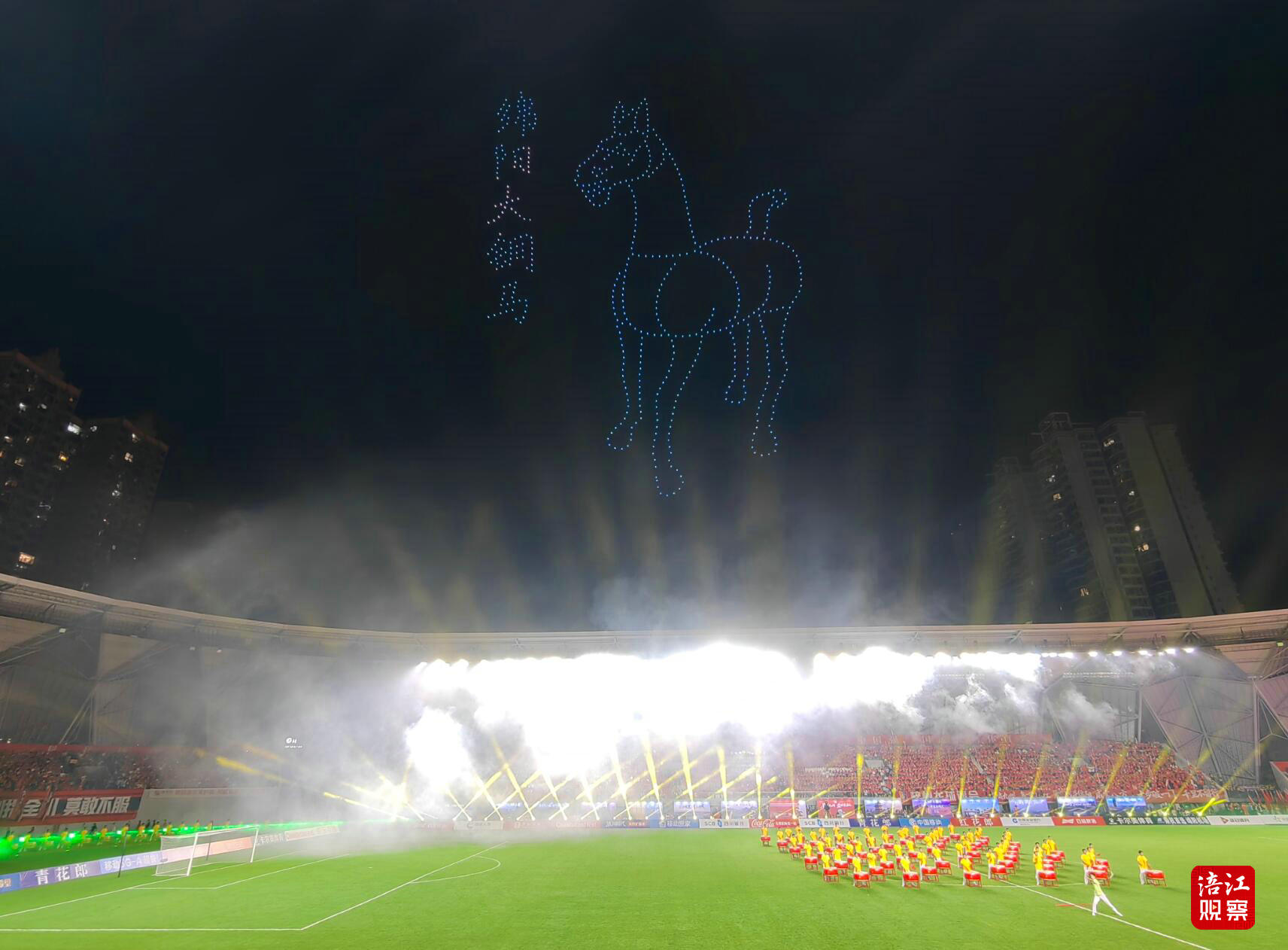 與德陽的“科技重裝德比”中,開球儀式上,無人機方陣變換出三星堆、李白形象等造型,用科技元素詮釋“古蜀同源、科技同行”的兄弟情誼;