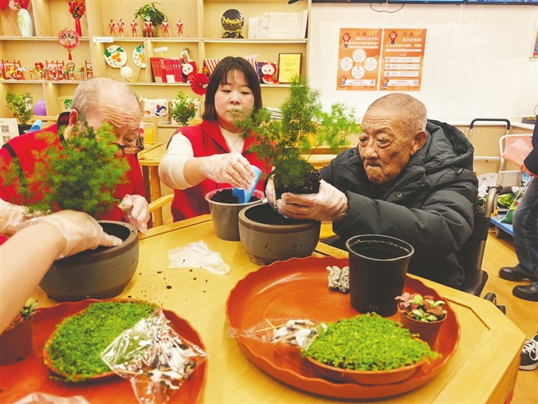 在北京市豐臺區(qū)北宮鎮(zhèn)養(yǎng)老服務(wù)中心,志愿者手把手教老人制作“松鶴延年”盆景。