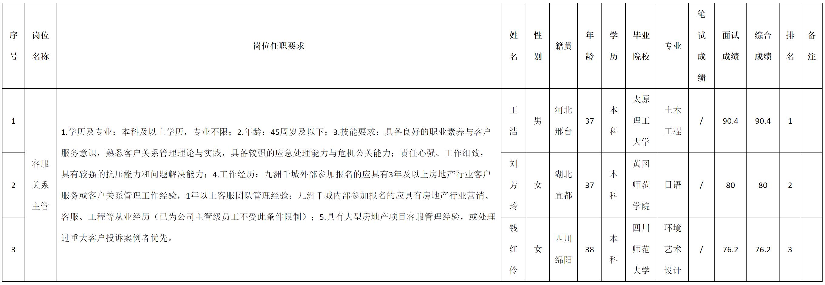 根據(jù)九洲千城置業(yè)有限責(zé)任公司發(fā)布的招聘公告及招聘相關(guān)規(guī)定,現(xiàn)將測試成績予以公示。