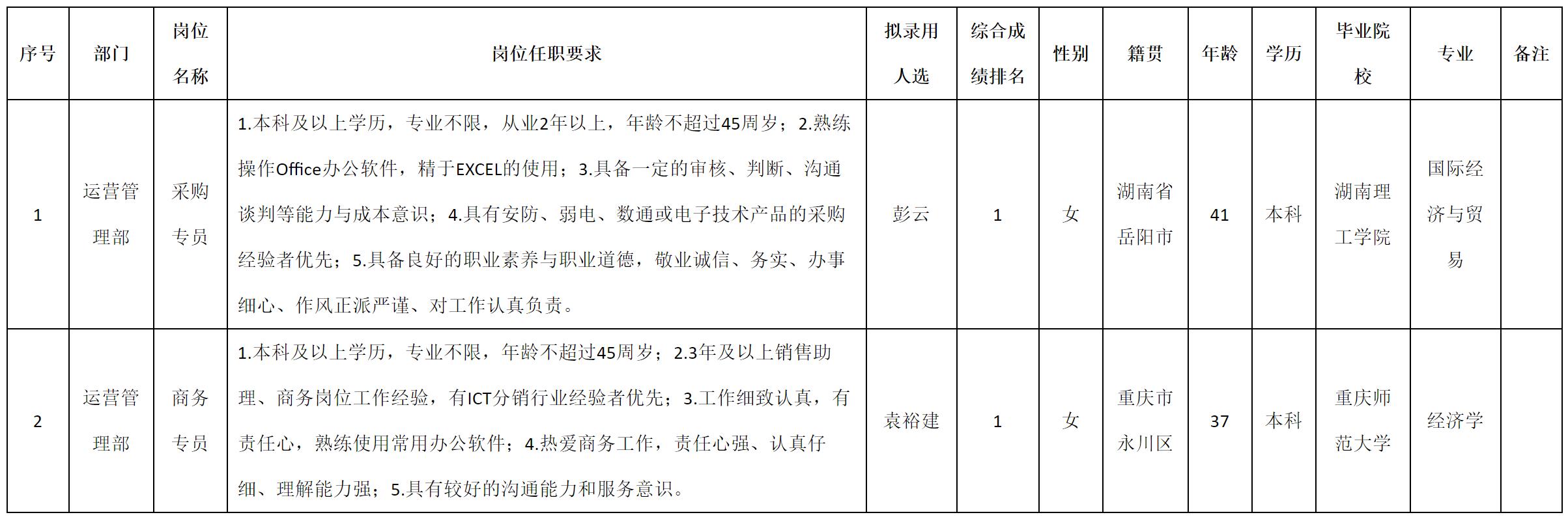 根據(jù)四川科瑞軟件有限責任公司發(fā)布的招聘公告及招聘相關規(guī)定,經測試、考察、體檢等程序,擬錄用彭云等2名同志到四川科瑞軟件有限責任公司工作,現(xiàn)予以公示,具體情況如下: