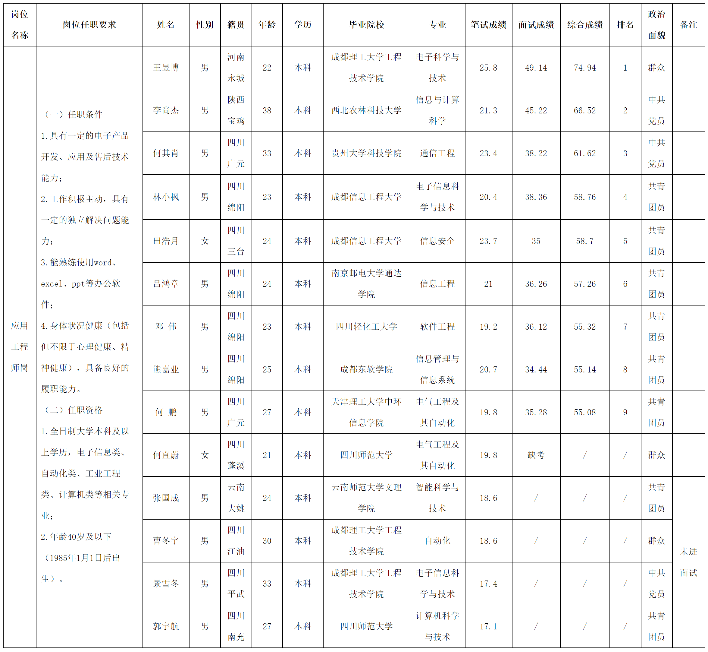 根據(jù)綿陽(yáng)燃?xì)饧瘓F(tuán)發(fā)布的招聘公告及招聘相關(guān)規(guī)定,經(jīng)筆試、面試等程序,現(xiàn)將綿陽(yáng)能創(chuàng)科技有限責(zé)任公司應(yīng)用工程師崗位筆試、面試成績(jī)予以公示。