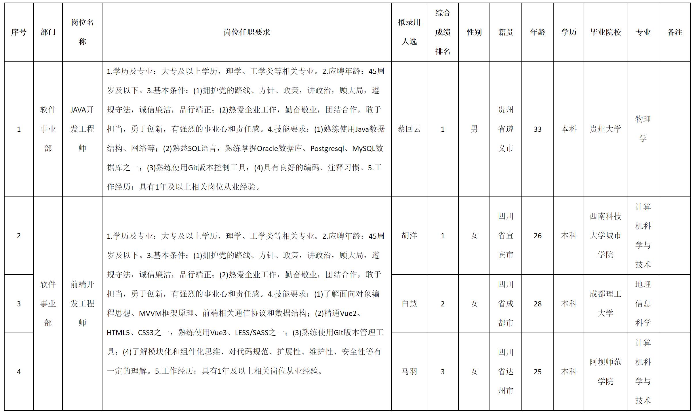 根據(jù)四川九強(qiáng)通信科技有限公司發(fā)布的招聘公告及招聘相關(guān)規(guī)定,經(jīng)測(cè)試、考察、體檢等程序,擬錄用蔡回云等4名同志到四川九強(qiáng)通信科技有限公司工作,現(xiàn)予以公示,具體情況如下: