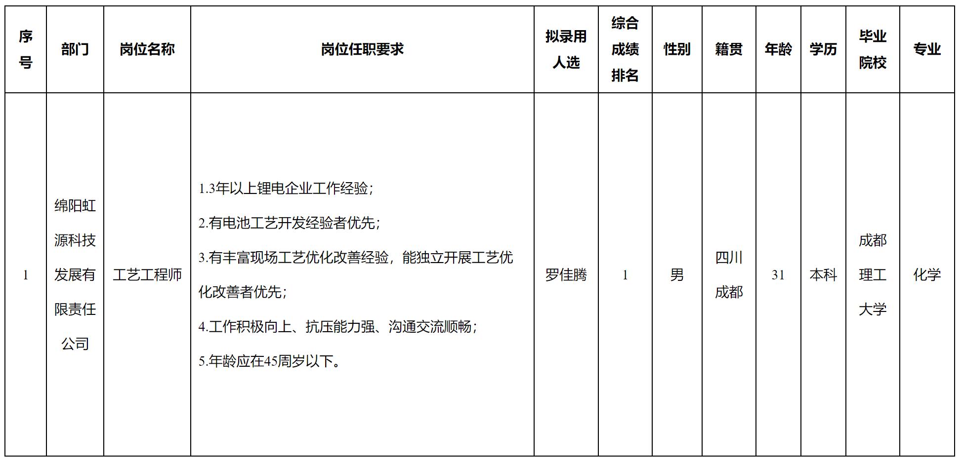 根據(jù)綿陽虹源科技發(fā)展有限責任公司發(fā)布的招聘公告及招聘相關(guān)規(guī)定,經(jīng)面試、考察、體檢等程序,擬錄用羅佳騰同志到我司工作,現(xiàn)予以公示,具體情況如下: