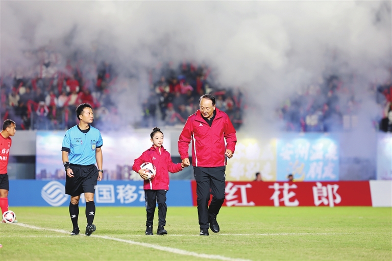 10月25日晚,川超聯(lián)賽綿陽九洲長虹隊主場對陣廣元劍門雄關(guān)隊。圖為開球嘉賓李日新(右)步入賽場?! ∮浾?陳冬冬 攝