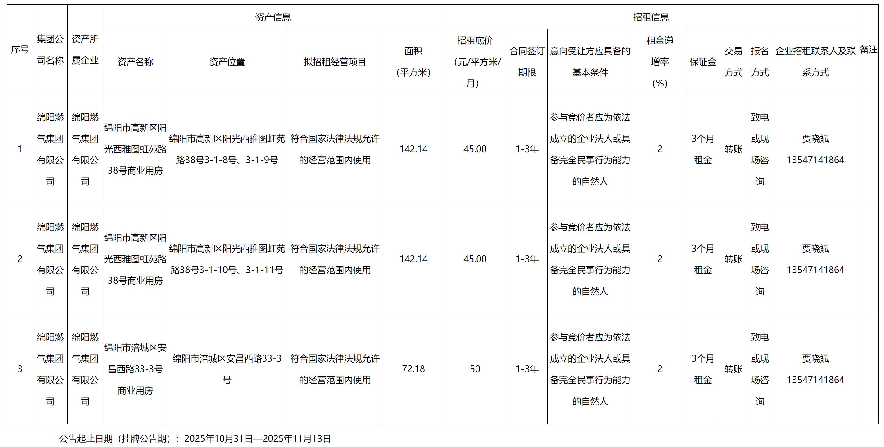 綿陽燃?xì)饧瘓F有限公司資產(chǎn)出租公告