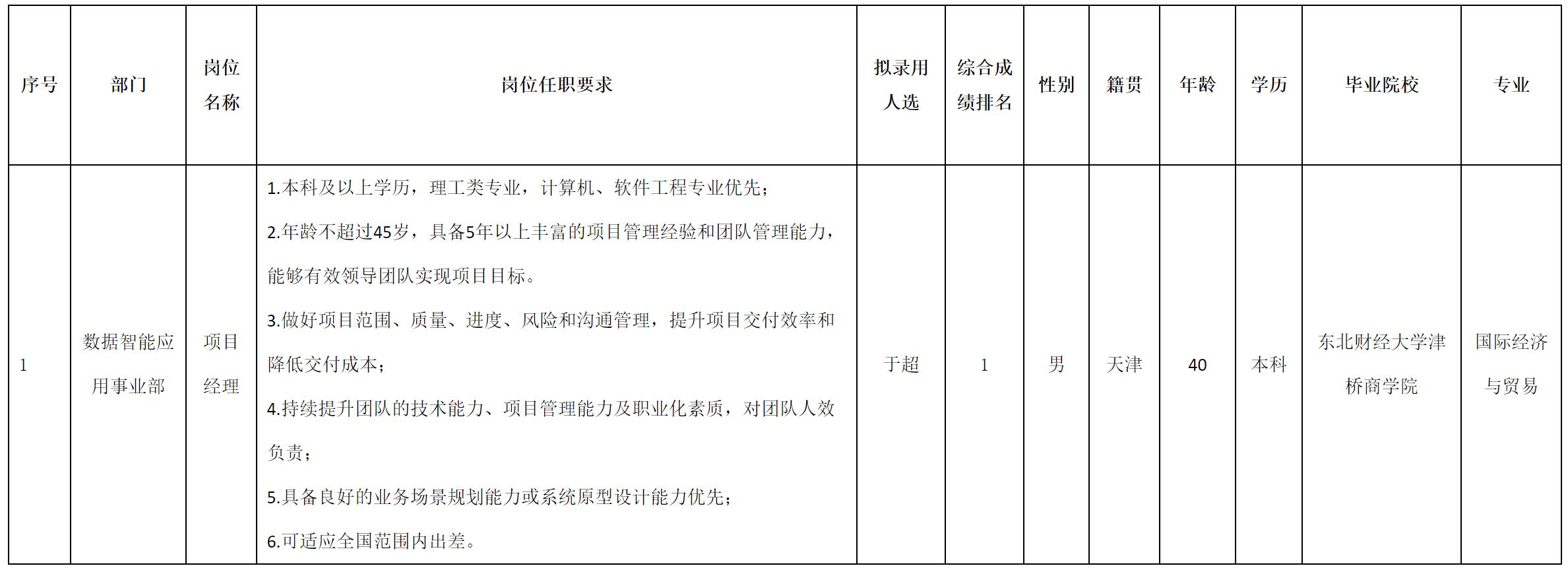 根據(jù)四川虹信軟件股份有限公司發(fā)布的招聘公告及招聘相關(guān)規(guī)定,經(jīng)測(cè)試、考察、體檢等程序,擬錄用于超同志到四川虹信軟件股份有限公司工作,現(xiàn)予以公示,具體情況如下: