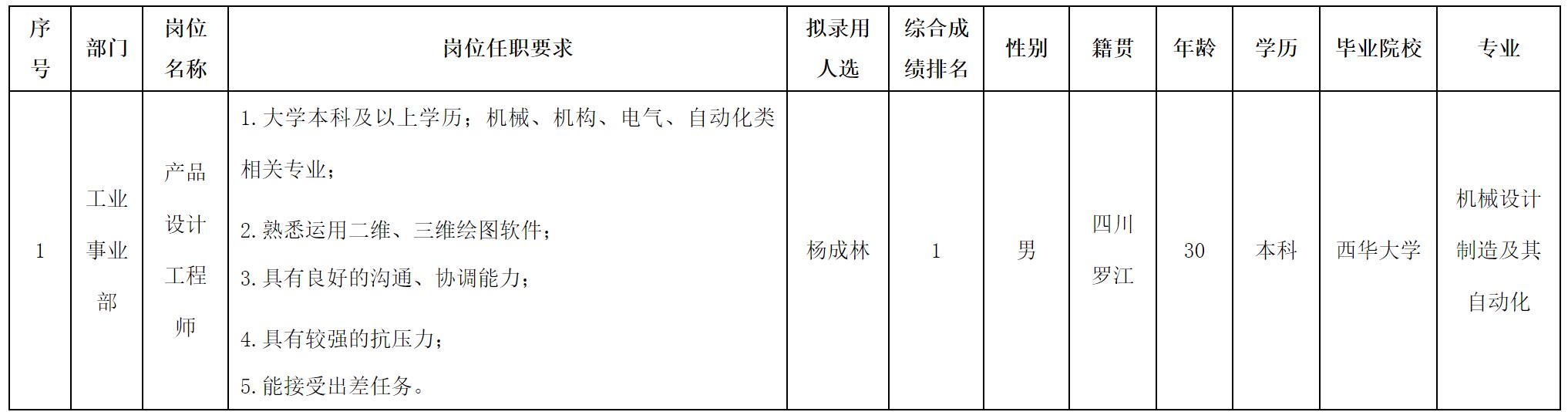 根據(jù)四川華豐科技股份有限公司發(fā)布的招聘公告及招聘相關規(guī)定,經(jīng)測試等程序,擬錄用楊成林同志到四川華豐科技股份有限公司工作,現(xiàn)予以公示,具體情況如下: