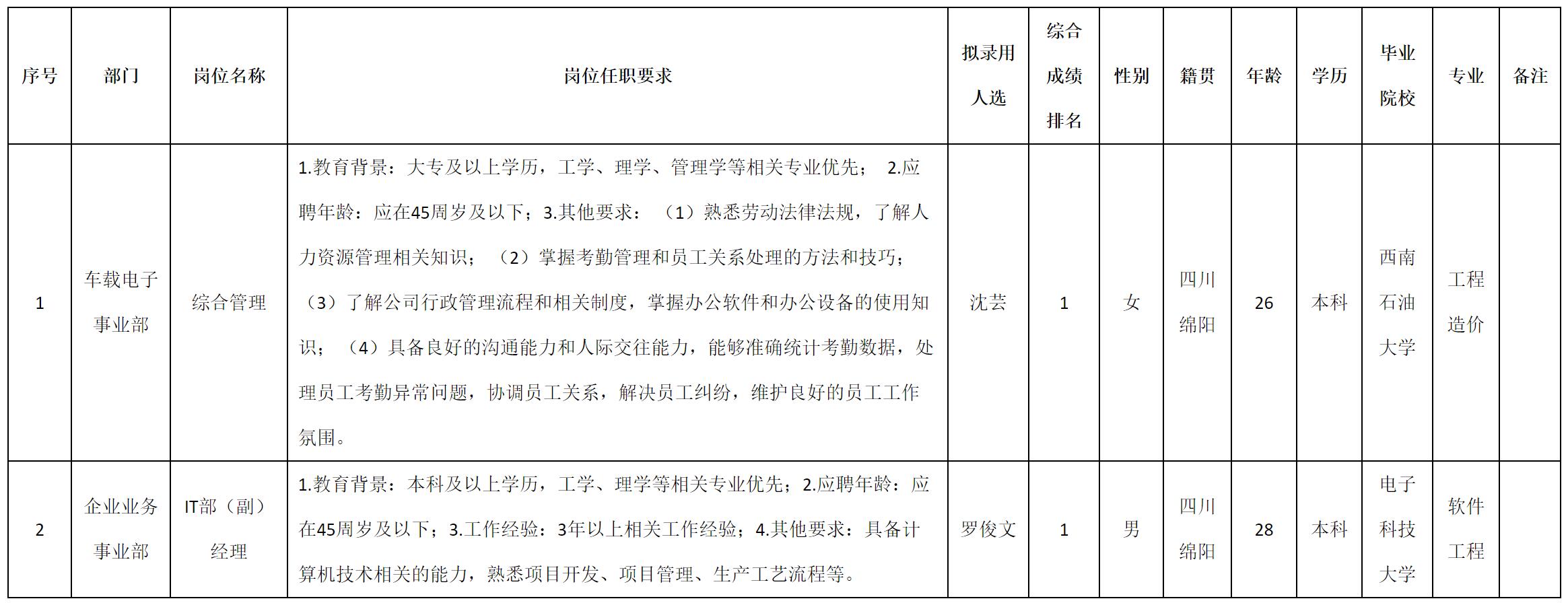 根據(jù)四川九州電子科技股份有限公司發(fā)布的招聘公告及招聘相關(guān)規(guī)定,經(jīng)測(cè)試、考察、體檢等程序,擬錄用沈蕓等2名同志到四川九州電子科技股份有限公司工作,現(xiàn)予以公示,具體情況如下: