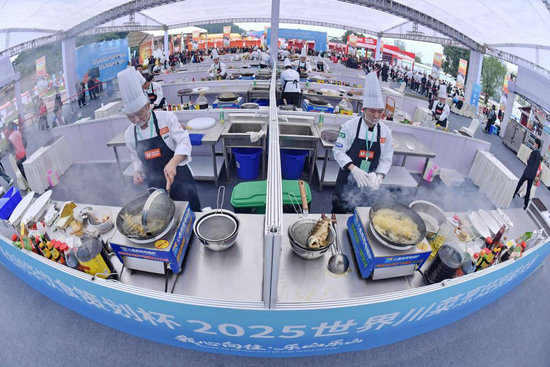 11月1日,第八屆世界川菜大會在四川樂山舉行。廚師在2025世界川菜烹飪技能大賽比賽中。新華社發(fā)(李向雨攝)
