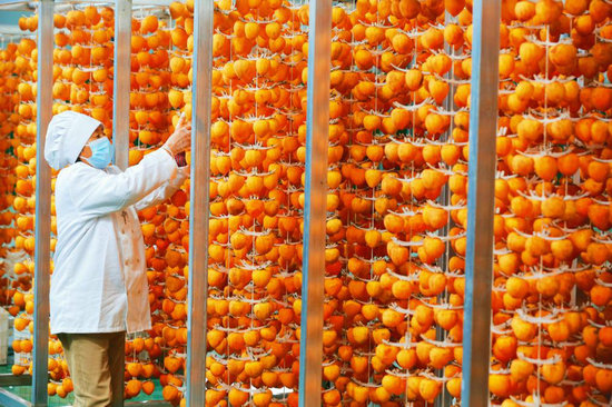 工人正在將預(yù)加工的柿子掛在晾曬架上準(zhǔn)備烘干。新華社記者 鄒尚伯 攝