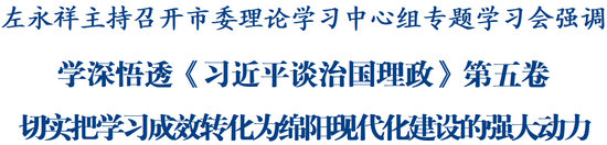 綿陽(yáng)新聞網(wǎng)訊 11月3日,市委理論學(xué)習(xí)中心組舉行專題學(xué)習(xí)會(huì),集中學(xué)習(xí)《習(xí)近平談治國(guó)理政》第五卷。省委常委、市委書(shū)記左永祥主持會(huì)議并談?wù)J識(shí)體會(huì)。他強(qiáng)調(diào),要學(xué)深悟透《習(xí)近平談治國(guó)理政》第五卷,更加深刻領(lǐng)悟習(xí)近平新時(shí)代中國(guó)特色社會(huì)主義思想的真理力量和實(shí)踐偉力,自覺(jué)從中悟規(guī)律、明方向、學(xué)方法、增智慧,切實(shí)把學(xué)習(xí)成效轉(zhuǎn)化為綿陽(yáng)現(xiàn)代化建設(shè)的強(qiáng)大動(dòng)力。
