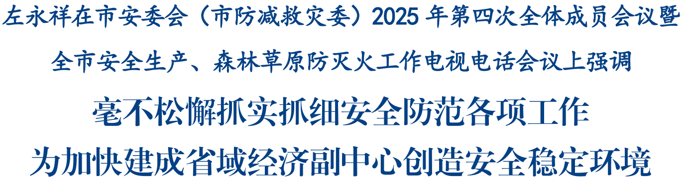 11月4日,市安委會(huì)(市防減救災(zāi)委)2025年第四次全體成員會(huì)議暨全市安全生產(chǎn)、森林草原防滅火工作電視電話會(huì)議召開,省委常委、市委書記左永祥出席會(huì)議并講話。他強(qiáng)調(diào),要深入學(xué)習(xí)貫徹習(xí)近平總書記關(guān)于安全生產(chǎn)、防災(zāi)減災(zāi)救災(zāi)重要論述和重要指示精神,全面落實(shí)黨中央、國務(wù)院和省委、省政府決策部署,樹牢底線思維、極限思維,毫不松懈抓實(shí)抓細(xì)安全防范各項(xiàng)工作,為加快建成省域經(jīng)濟(jì)副中心創(chuàng)造安全穩(wěn)定環(huán)境。