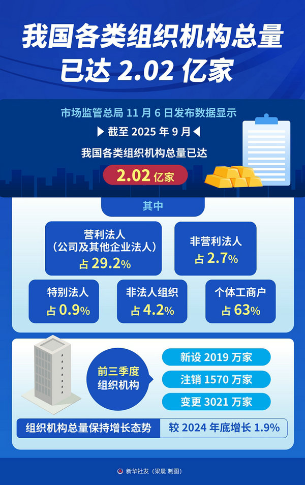 新華社北京11月6日電(記者趙文君)市場(chǎng)監(jiān)管總局6日發(fā)布數(shù)據(jù)顯示,截至2025年9月,我國(guó)各類(lèi)組織機(jī)構(gòu)總量已達(dá)2.02億家。其中,營(yíng)利法人(公司及其他企業(yè)法人)占29.2%;非營(yíng)利法人占2.7%;特別法人占0.9%;非法人組織占4.2%;個(gè)體工商戶(hù)占63%。