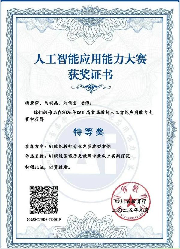 在四川省首屆教師人工智能應(yīng)用能力大賽中,馬琬晶、劉俐君老師以AI賦能歷史教學(xué)為核心,有效破解了傳統(tǒng)課堂痛點(diǎn),榮獲特等獎(jiǎng)。